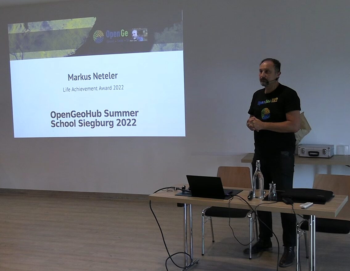 Thank you. So, Markus Neteler, you’re a real giant of open source GIS and we are so grateful to you for everything you have done. And this is not your retirement. This is just a little moment in time and space where we want to tell you that we’re really grateful for everything you have done and you will always stay in our hearts and you’re always welcome to come back to the summer schools. And so one more time, it’s not the retirement. We still expect a lot of things from you. And please come here and accept this Life Achievement Award from the Open Geo Heart Foundation. Thank you very much. Thank you.
