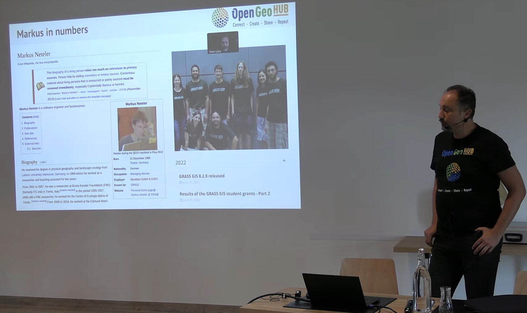 So for those of you maybe that are not familiar, Markus was not in this summer school, but I think if you google his name you will see that he is still one of the main contributors to the GRASS GIS and he is one of the founding members of the GRASS User Association, which is one of the world’s most known open source GRASS software. He also contributes to the open source OSGeo Foundation and he won also, I see on your Wikipedia page that you won the Sol Katz award and you have as I said participated in many cou rses and conference workshops and of course now summer school.